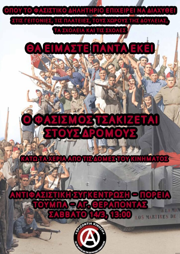 Ως αναρχικοί/ες πιστεύουμε πως ο φασισμός τσακίζεται στους δρόμους, με μαχητικότητα, άμεση δράση και αντιφασιστική ενότητα. Γνωρίζουμε επίσης καλά πως το δηλητήριο του κοινωνικού εκφασισμού αντιμετωπίζεται με παρέμβαση σε καθημερινή βάση, σε κάθε κοινωνικό πεδίο: Στις γειτονιές, τις πλατείες, τα σχολεία και τις σχολές, στους χώρους εργασίας μας. Οπουδήποτε οι φασίστες προσπαθούν να σηκώσουν κεφάλι, εκεί πρέπει να είμαστε εμείς για να τους το κόψουμε. Μαζί με την τάξη μας, το πολυεθνικό προλεταριάτο, θα στείλουμε τους φασίστες πίσω στις τρύπες τους για άλλη μια φορά.