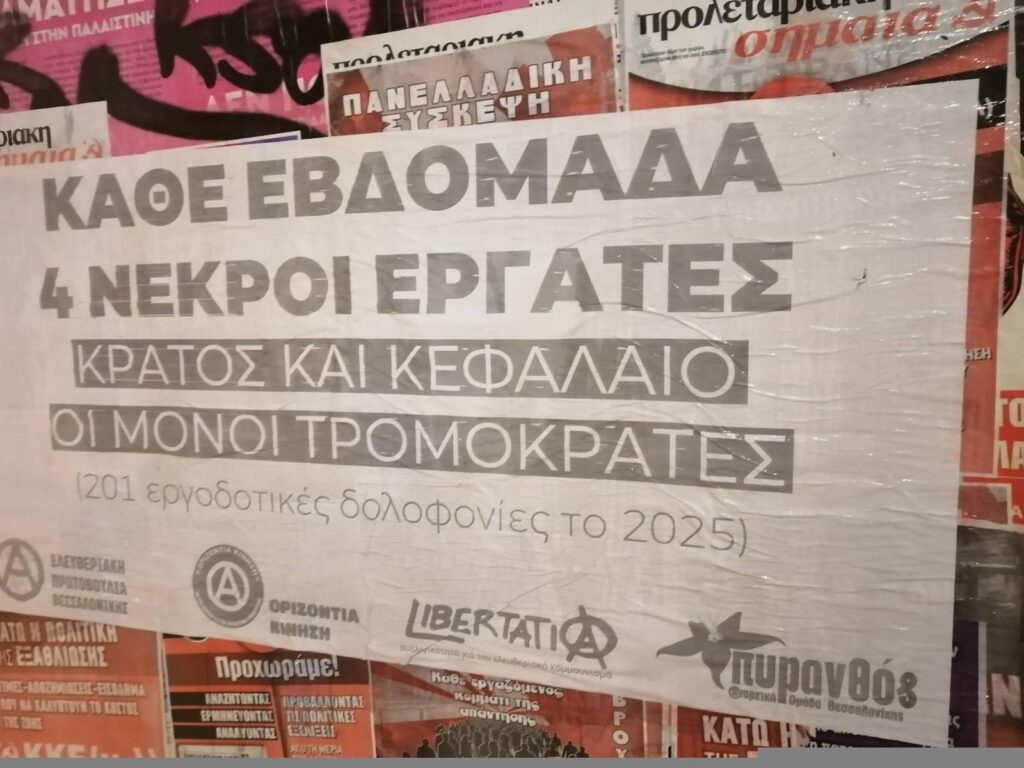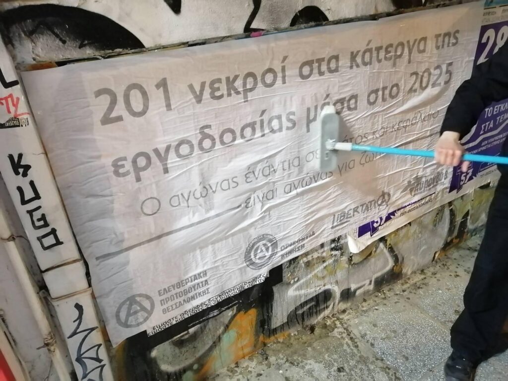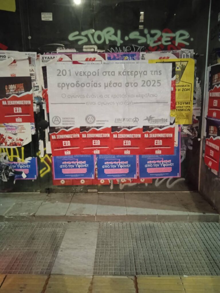 ⒶΚατά το προηγούμενο διάστημα πραγματοποιήσαμε από κοινού μαζική αφισοκόλληση γιγαντοαφισών / πλότερ στο ευρύτερο κέντρο και σε περιοχές των ανατολικών της Θεσσαλονίκης, σχετικά με το ζήτημα των εργοδοτικών δολοφονιών.