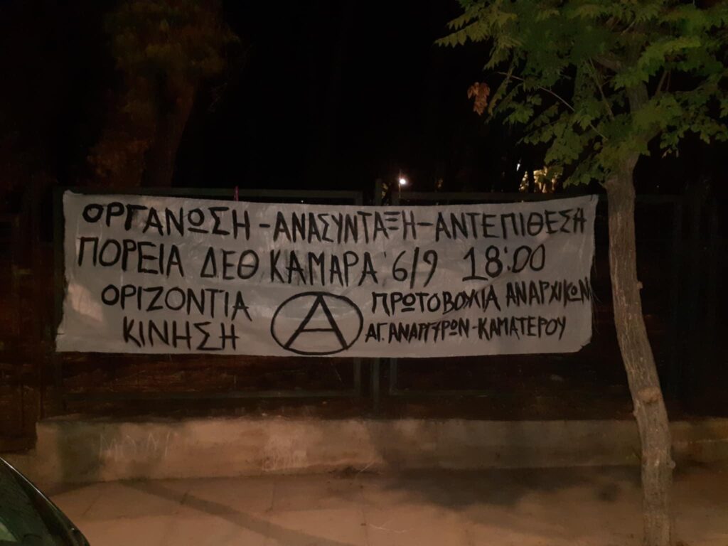 Στο τέλος της παρέμβασης, η ομάδα μας ανήρτησε πανό στα κάγκελα της Καμάρας το οποίο καλεί σε στήριξη στις σημερινές αντιφασιστικές διαδηλώσεις.