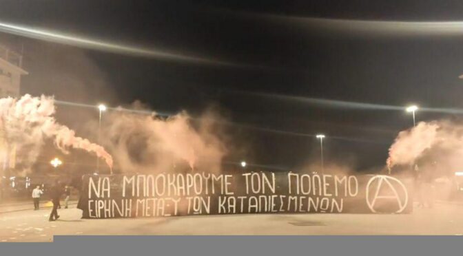 Ανοίξαμε γιγαντοπανό με το σύνθημα “Να μπλοκάρουμε τον πόλεμο – Ειρήνη μεταξύ των καταπιεσμένων”, φωνάξαμε αντιπολεμικά – διεθνιστικά συνθήματα και πετάξαμε τρικάκια, ενώ ανάψαμε και καπνογόνα.