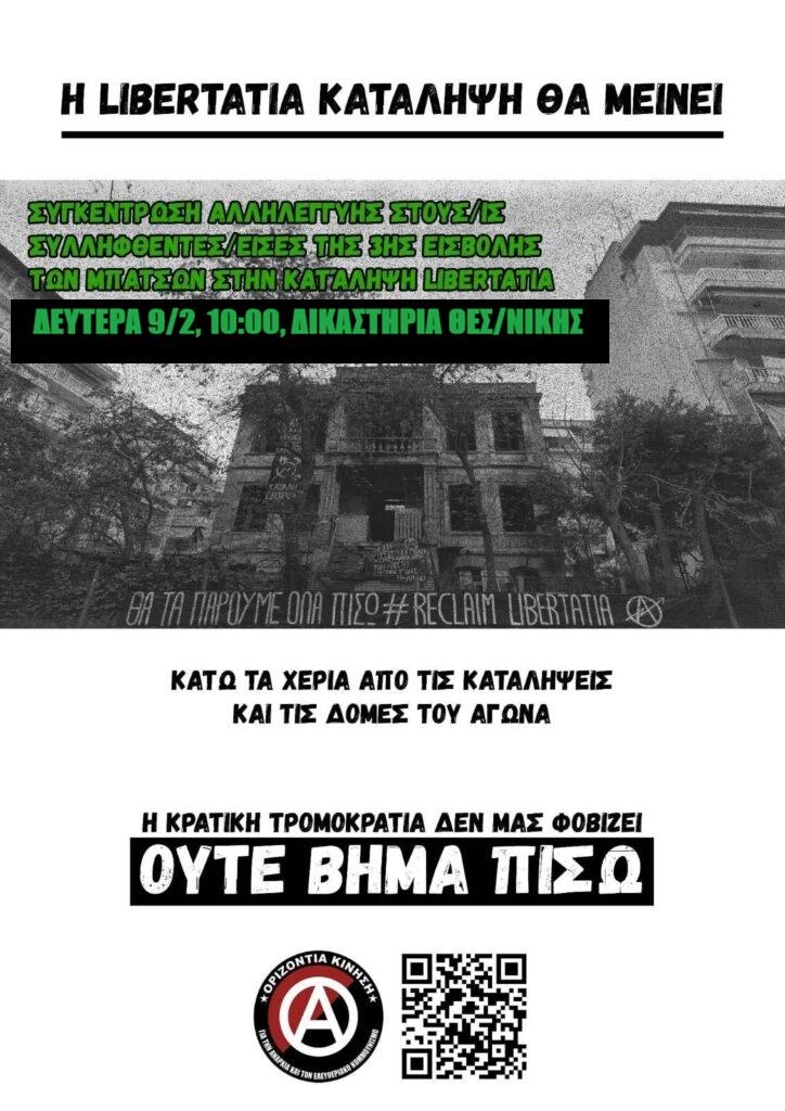 Την Δευτέρα 9/2 εκδικάζεται η υπόθεση της 3ης εισβολής στην Κατάληψη Libertatia, που έλαβε χώρα στις 23/8/2020, με αποτέλεσμα 12 συλλήψεις συντρόφων/ισσών που φέρουν τις κατηγορίες της παράνομης επέμβασης σε διατηρητέο κτίριο και της αντίστασης κατά της αρχής.